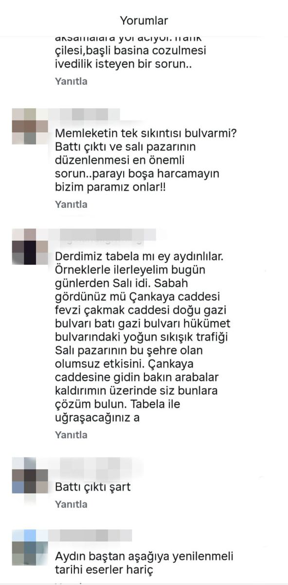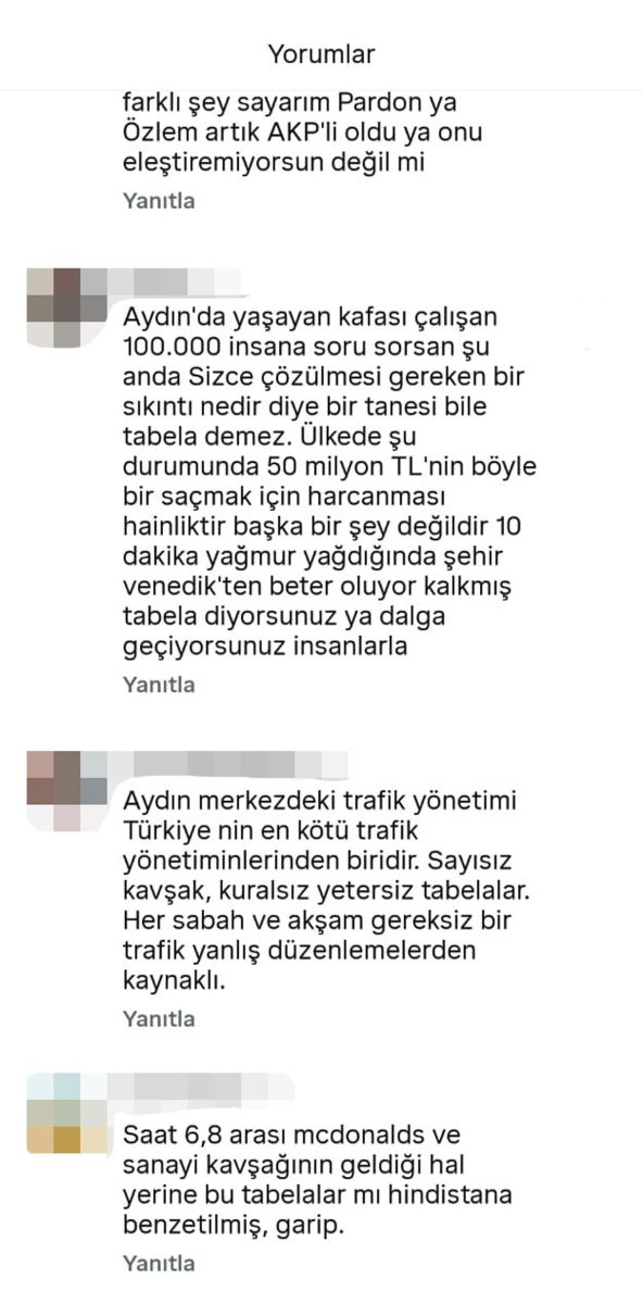 Aydın’ın en temel sorunları arasında gösterilen salı pazarı trafiği, yetersiz altyapı, yaya yollarındaki işgaller, bakımsız yeşil alanlar ve esnafın ekonomik çöküşü gibi konuların göz ardı edilmesi, halkı adeta çileden çıkardı. “Trafiği çözün, esnafı ayağa kaldırın, mahalleler dökülüyor. O parayı sokağa harcayın, vitrine değil” diyen birçok yorumcu, 50 milyon TL’nin tabela yerine halkın gerçek sorunlarına harcanmasını talep etti.