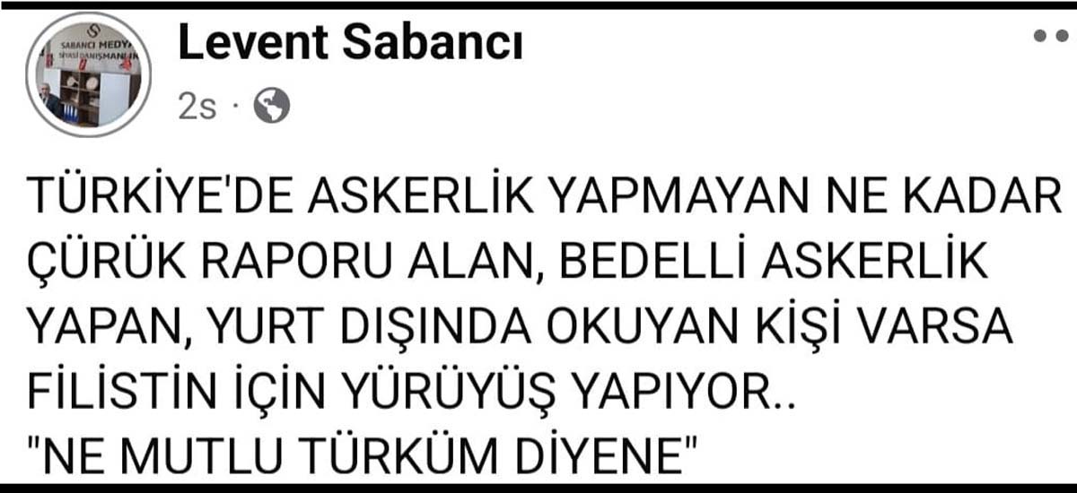 İşte Çerçioğlu’nun trolü olarak tanımlanan Levent Sabancı’nın, Bilal Erdoğan ve Filistin yürüyüşüne katılanları hedef alan o paylaşımı;