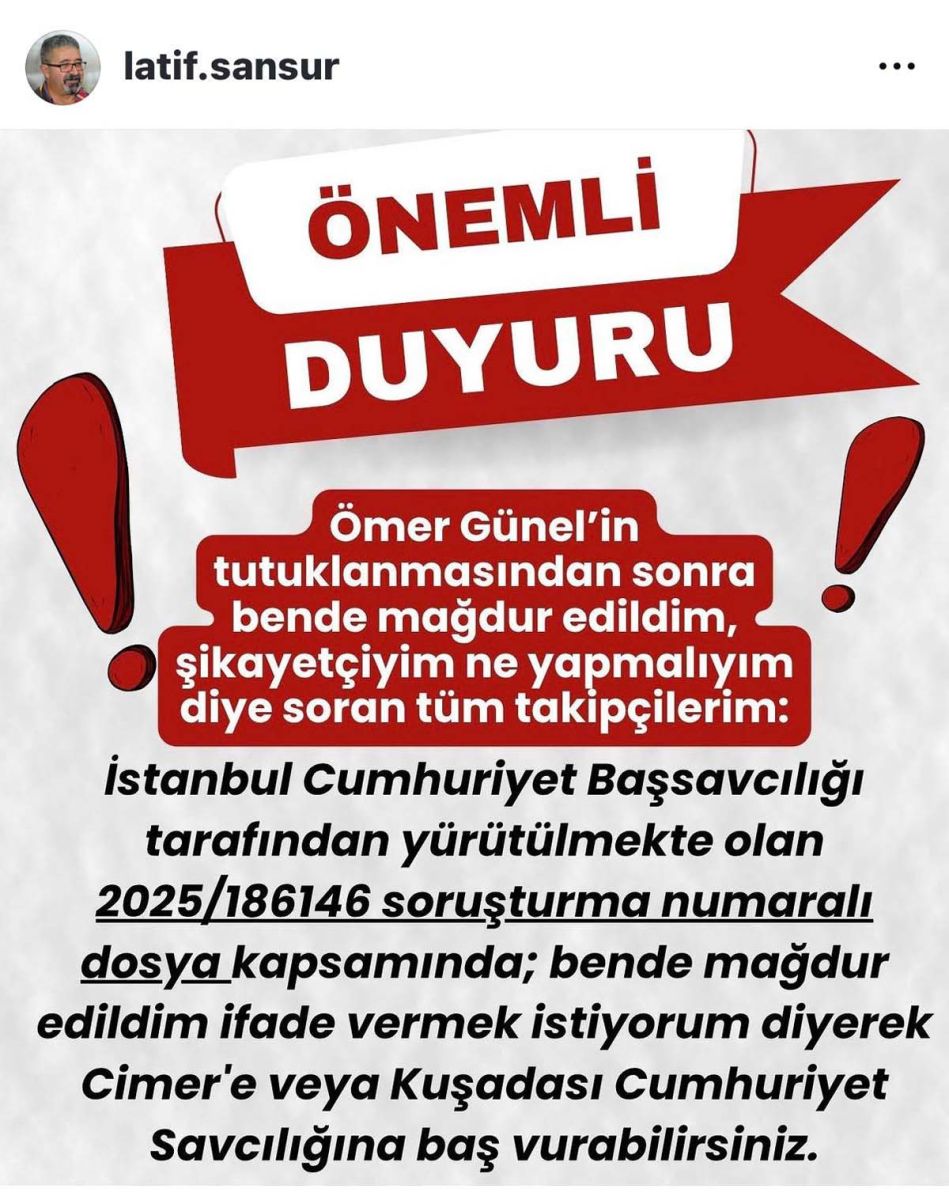 Latif Sansür isimli şahıs kendi hesabından yaptığı paylaşım ile Ömer Günel hakkında şikayetçi olmak isteyenleri İstanbul Cumhuriyet Başsavcılığı ve Cimer'e şikayet çağrısında bulundu.